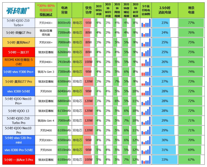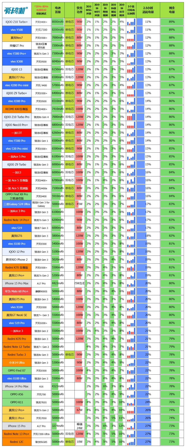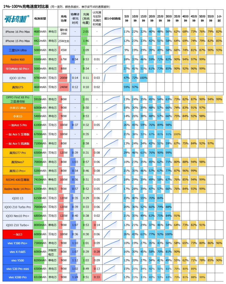 (充电测试,1%开始。同一行的颜色条越长,速度越快↑。已打开vivo超快充电模式/OPPO智能极速充电/小米快充加速与低电疾充等功能。部分厂商/机型默认关闭相关功能,需手动开启)或者省流一点,每5分钟充10%