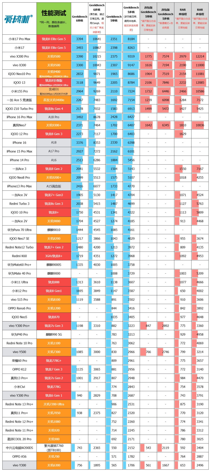 CPU性能测试(每一列,颜色条越长,越强)(右侧4个不在白名单中的测试,更能反映日常能用到的性能输出)