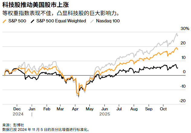 若不是新一轮人工智能热潮,股市的涨幅会平淡得多。大型科技公司贡献了指数涨幅的大头,而传统工业企业和消费品卖家则在关税与经济放缓中举步维艰。剔除市值偏重的等权版本标普500今年仅上涨5.2%,中位数股票涨幅仅1.2%,七大科技巨头合计贡献了市场涨幅的一半以上。