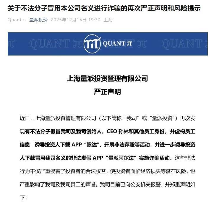 12月15日晚,量派投资严正声明,相关非法行为不仅严重侵害了投资者的合法权益,使投资者面临经济损失等潜在风险,也严重影响了公司及公司员工的声誉。目前,量派投资已向公安机关报警。